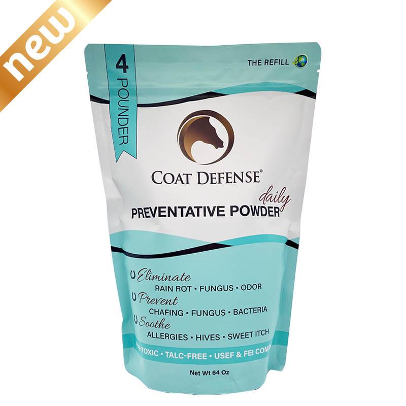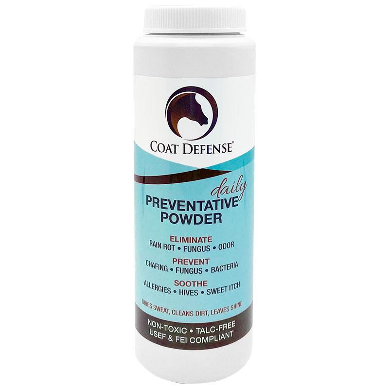 COAT DEFENSE® daily PREVENTATIVE POWDER is a natural, safe and effective solution for preventing and treating equine skin issues such as rain rot, itch and odor. It is revolutionary because it prevents chafing, fungus and pathogenic microbes from taking up residence on your horse. It's a game changer because it soothes and calms allergies, hives and sweet itch without harsh medications. It is effective for drying sweat and moisture quickly, saving you time and preventing your horse from freezing when temperatures drop. In addition to alleviating skin problems, it can be used between baths as a dry shampoo.